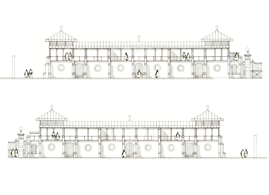 Terraces of cottages built facing into a restored Victorian fruit and vegetable kitchen garden with restored glasshouses and potting sheds.